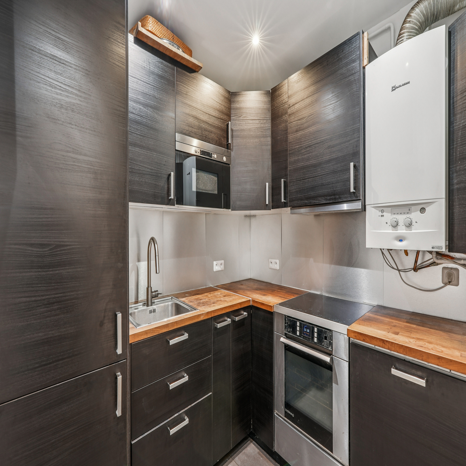 De l'autre coté une cuisine séparée, à la fois fonctionnelle et élégante, équipée d’un four, d'un micro-ondes, d’une hotte, de plaques de cuisson électrique, d’un lave-vaisselle, ainsi que de nombreux meubles haut et bas de rangements, cette cuisine s'ouvre sur une courette privative idéal pour prendre un café en exeterieur.