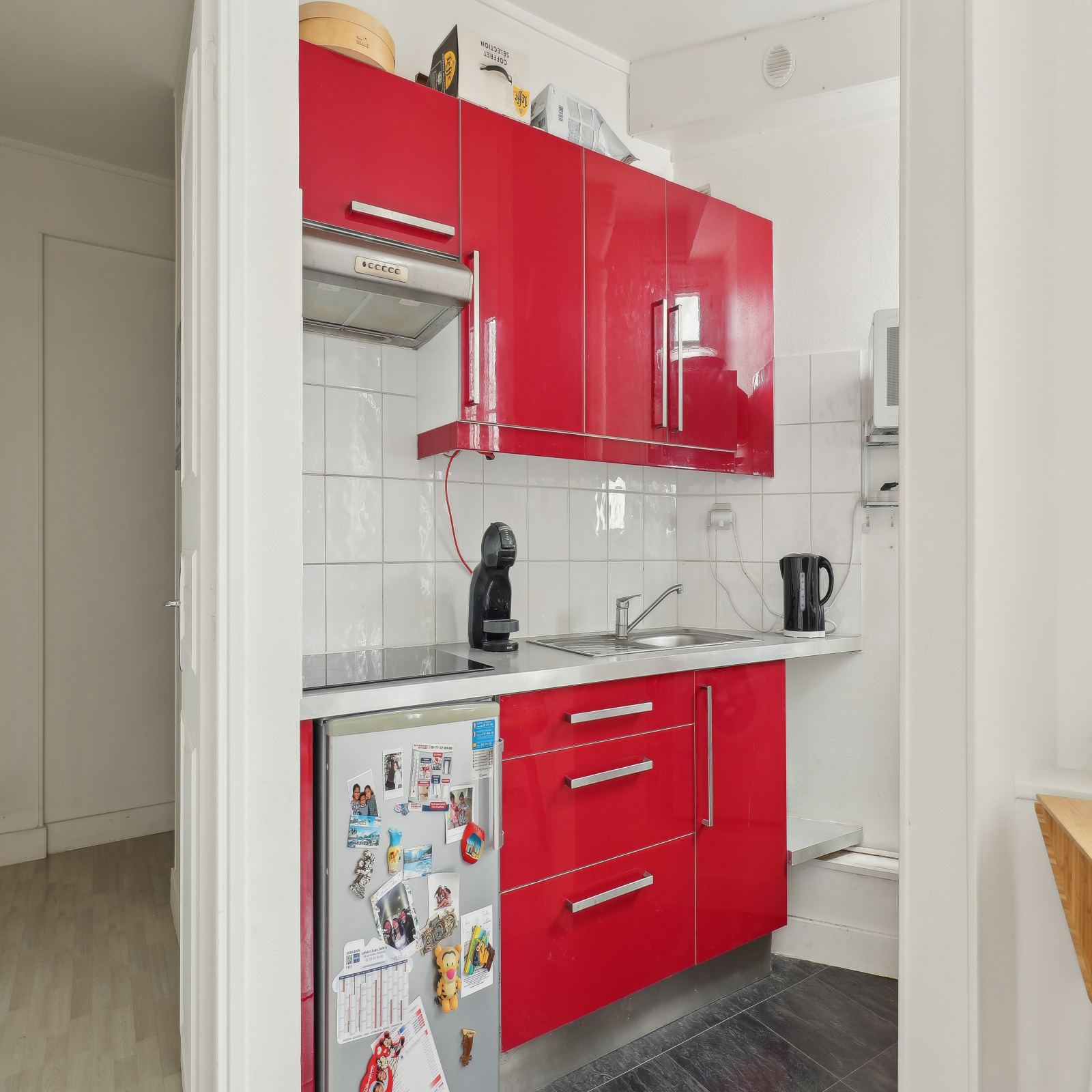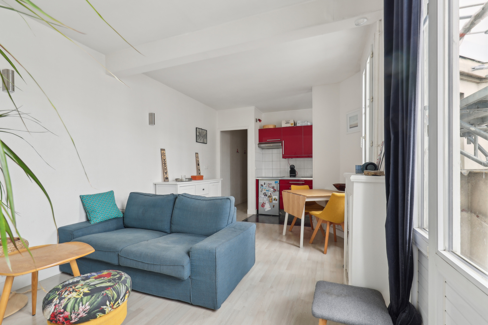Il se compose d'une entrée, distribuant une salle d'eau avec vasque, cabine de douche et toilette, puis d'un dégagement menant à une cuisine américaine équipée (plaque, frigo, hôte) ouverte sur un beau séjour avec petit balcon.