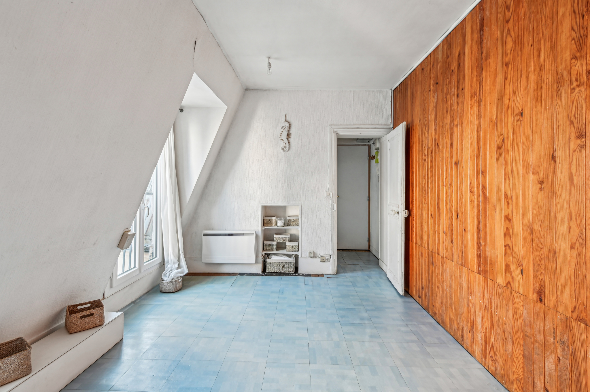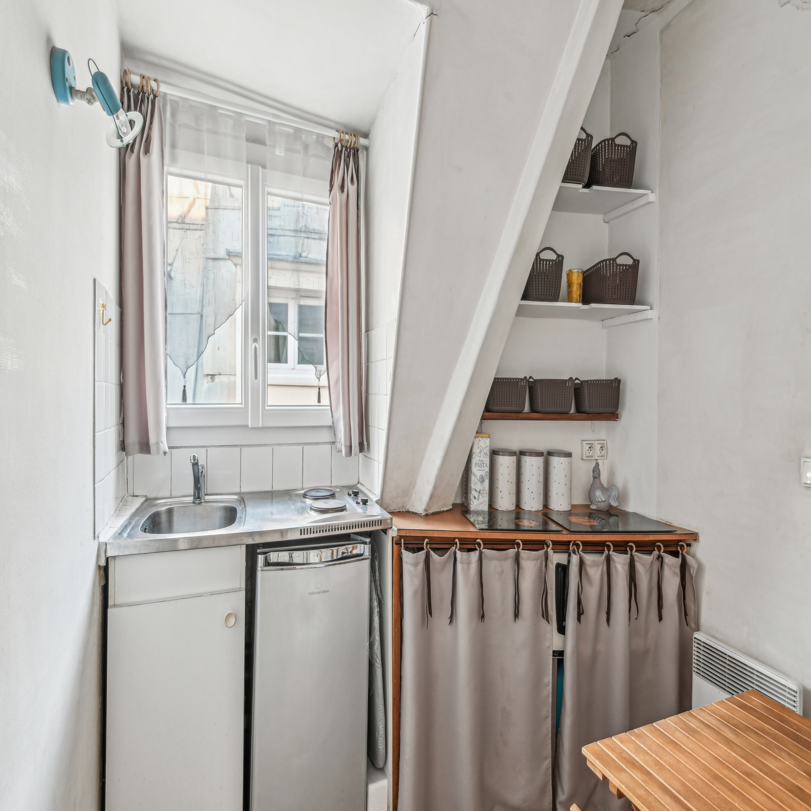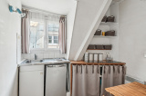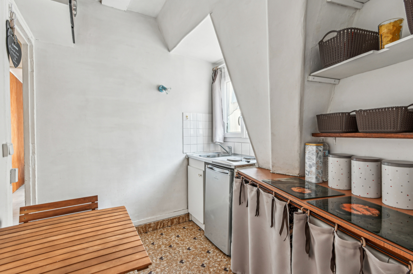 Il se compose d'une belle pièce de vie lumineuse exposée Ouest avec vue sur les toits de Paris avec étagère de rangement, d'une cuisine séparée et d'une salle d'eau avec vasque, douche et WC.