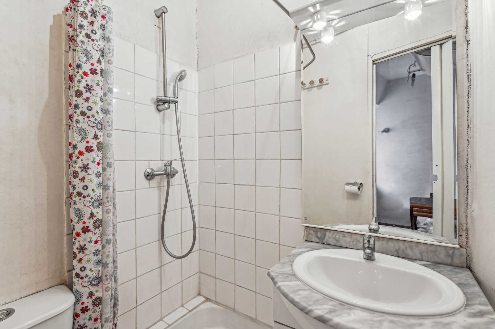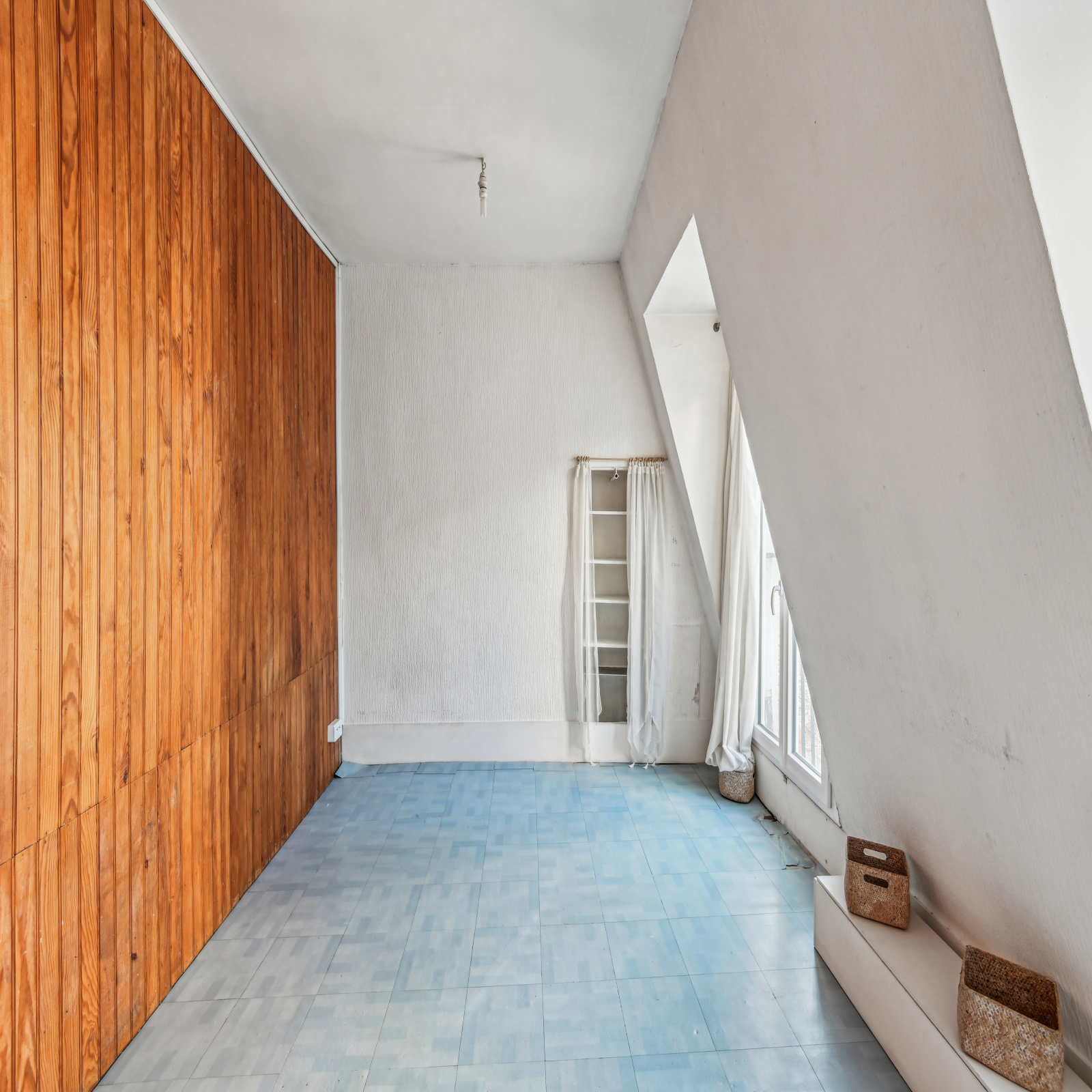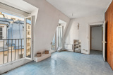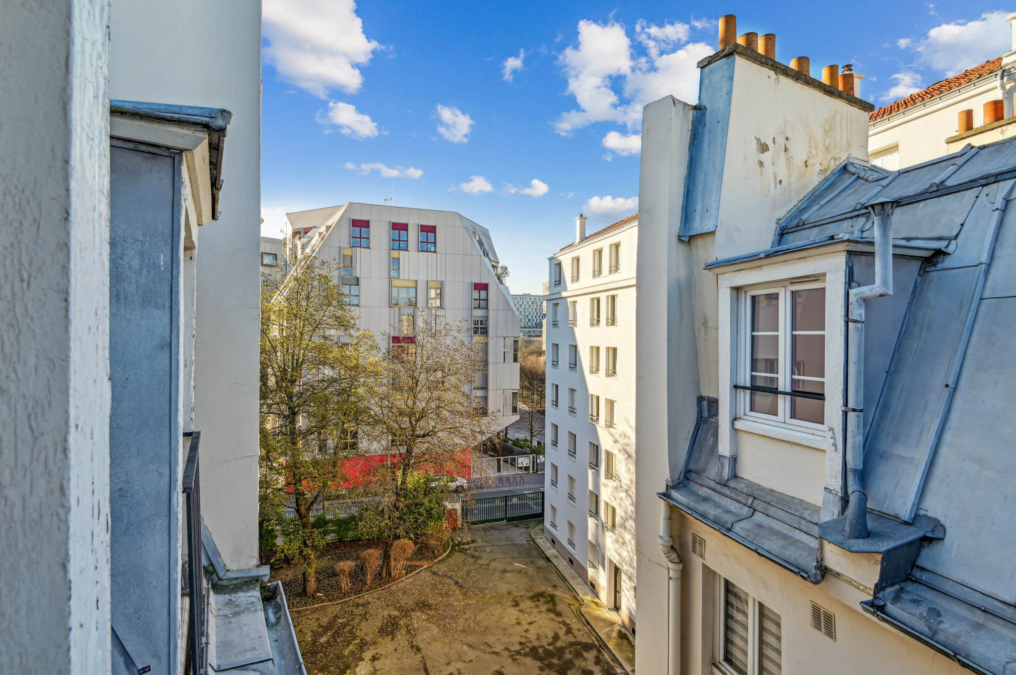 Il se compose d'une belle pièce de vie lumineuse exposée Ouest avec vue sur les toits de Paris avec étagère de rangement, d'une cuisine séparée et d'une salle d'eau avec vasque, douche et WC.