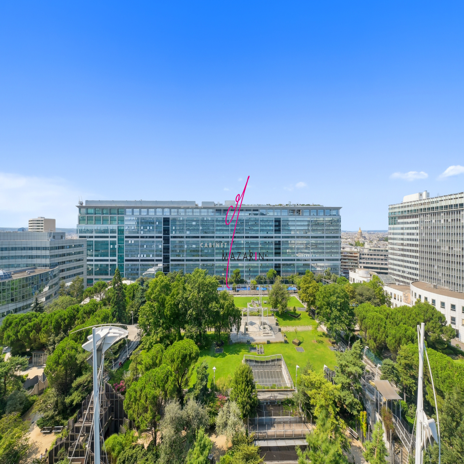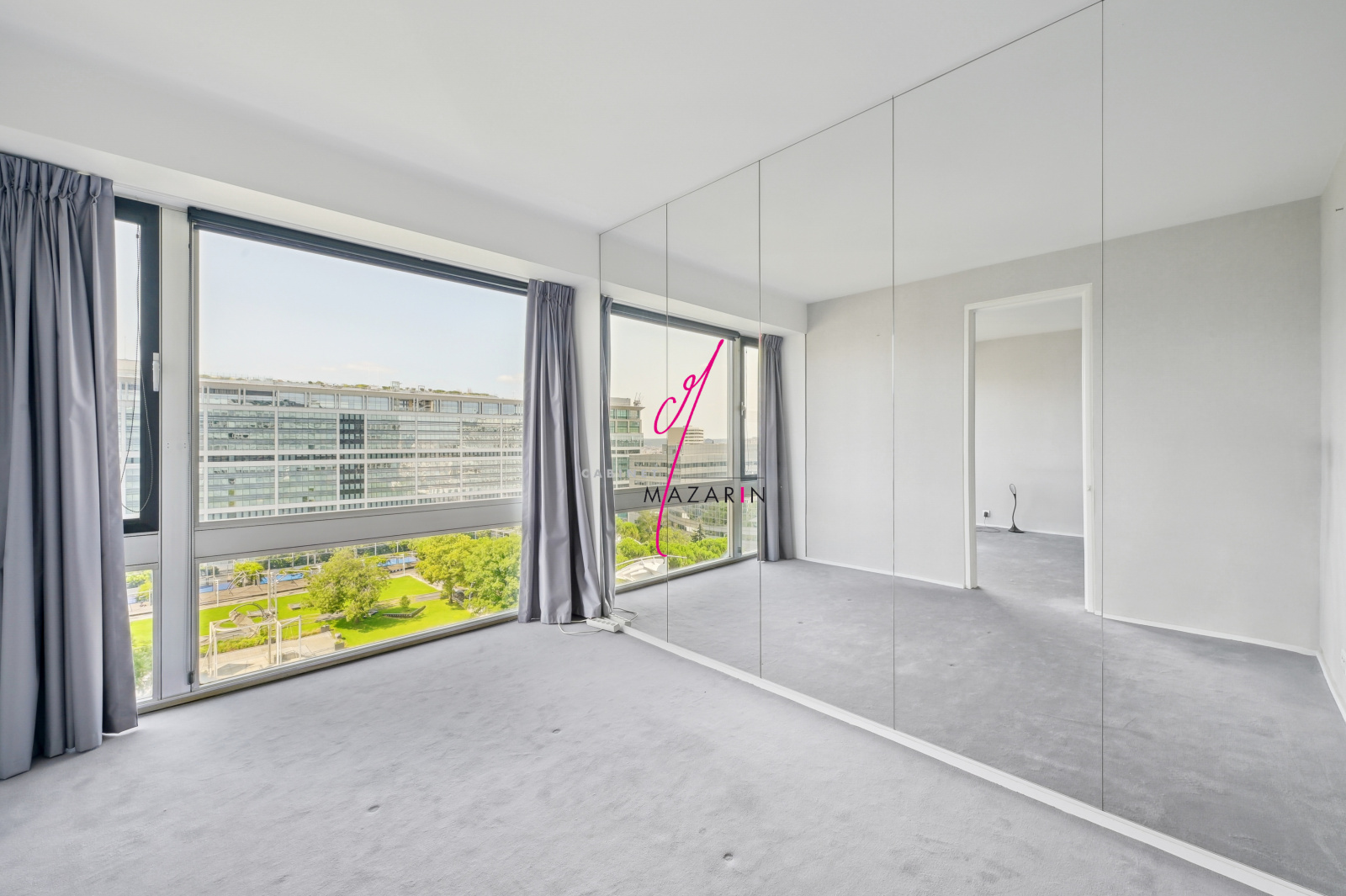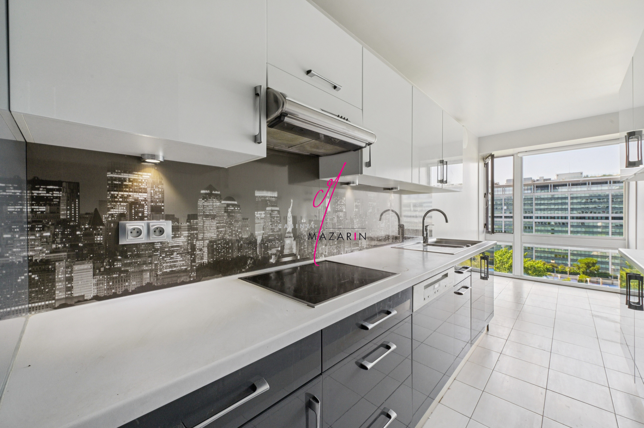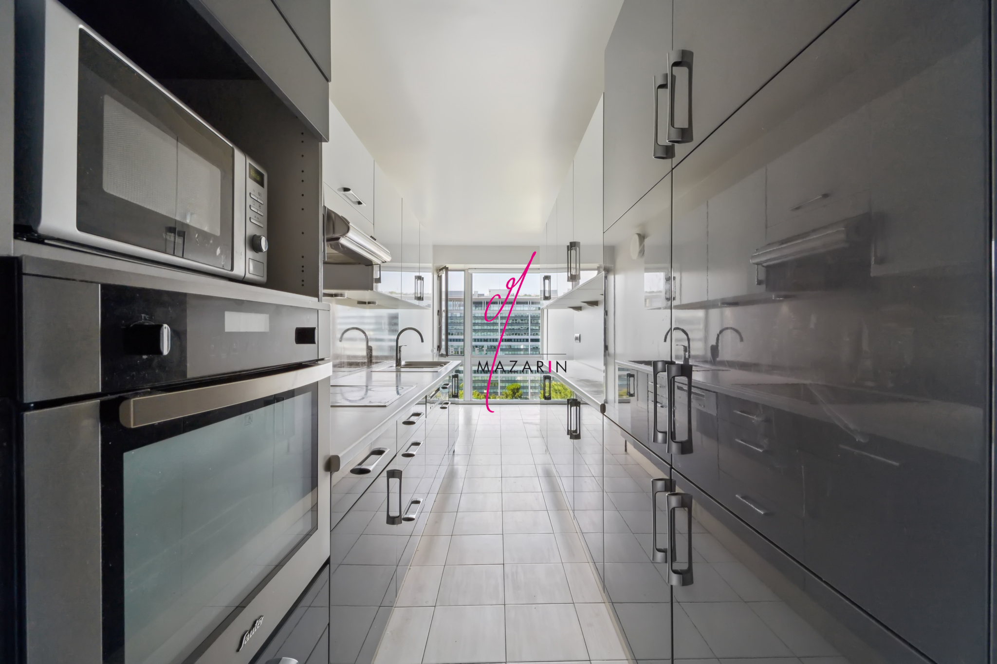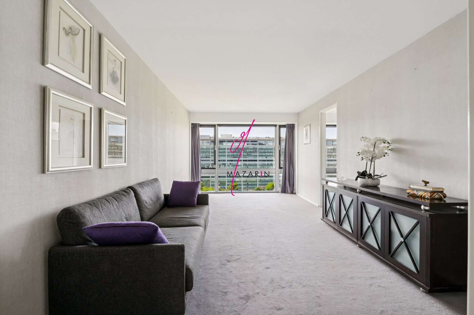 D'un côté un spacieux séjour / salle à manger (pouvant faire office de 3ème chambre) très lumineux, exposé Nord Ouest, offrant une vue imprenable, totalement dégagée et sans vis à vis sur le Jardin Atlantique et le Dôme des invalides, ainsi qu'une grande cuisine séparée et équipée.