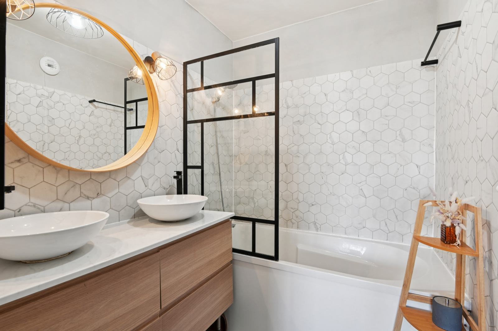 Dans le prolongement de cet espace, vous découvrirez une élégante chambre parentale en suite agrémentée d'une salle de bain moderne composée d'une double vasque, d'une baignoire avec pare-douche ainsi que de WC.