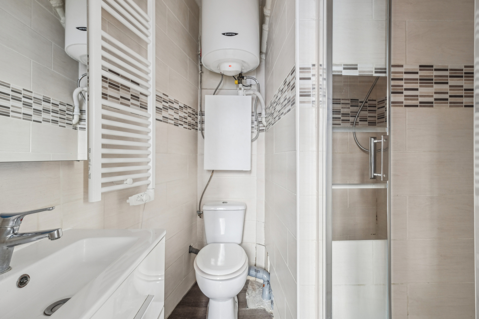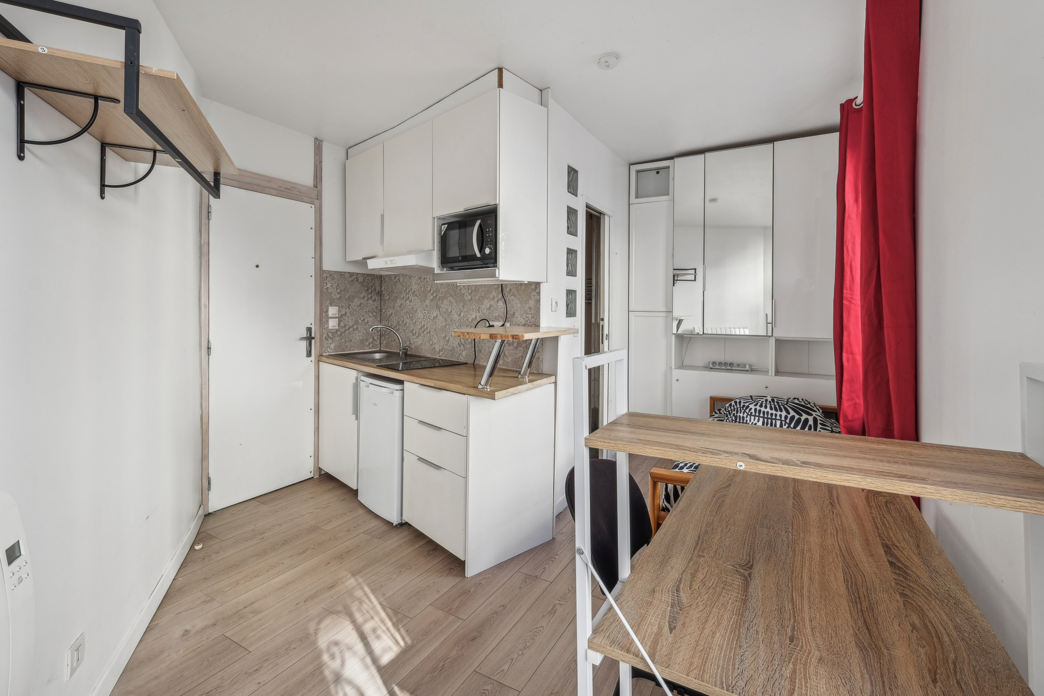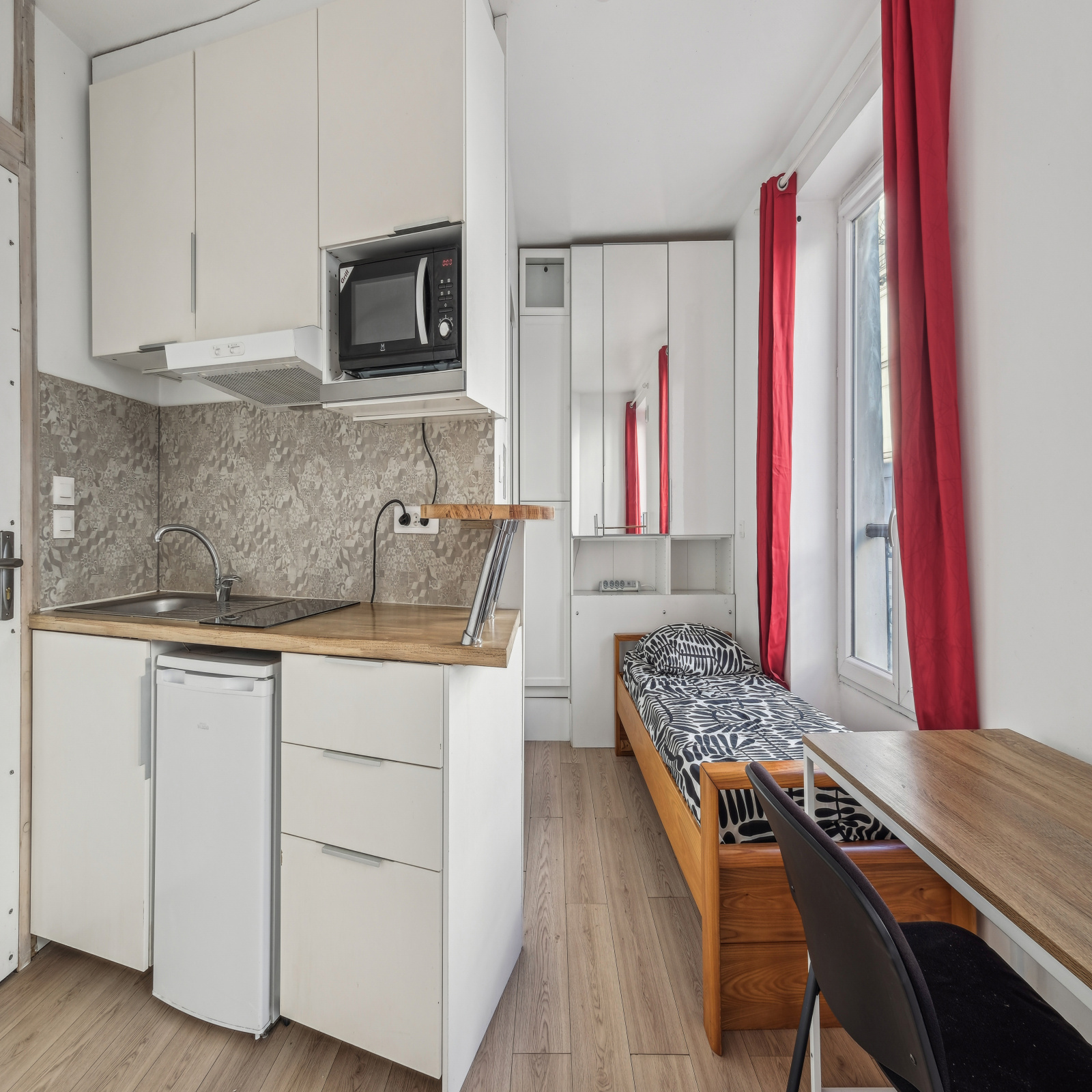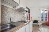 Il se compose d'une entrée avec une cuisine US équipée (plaque, hotte, meuble haut et bas de rangement), un séjour avec meuble de rangement et deux grandes fenêtres et d'une salle d'eau avec vasque, WC et cabine de douche.