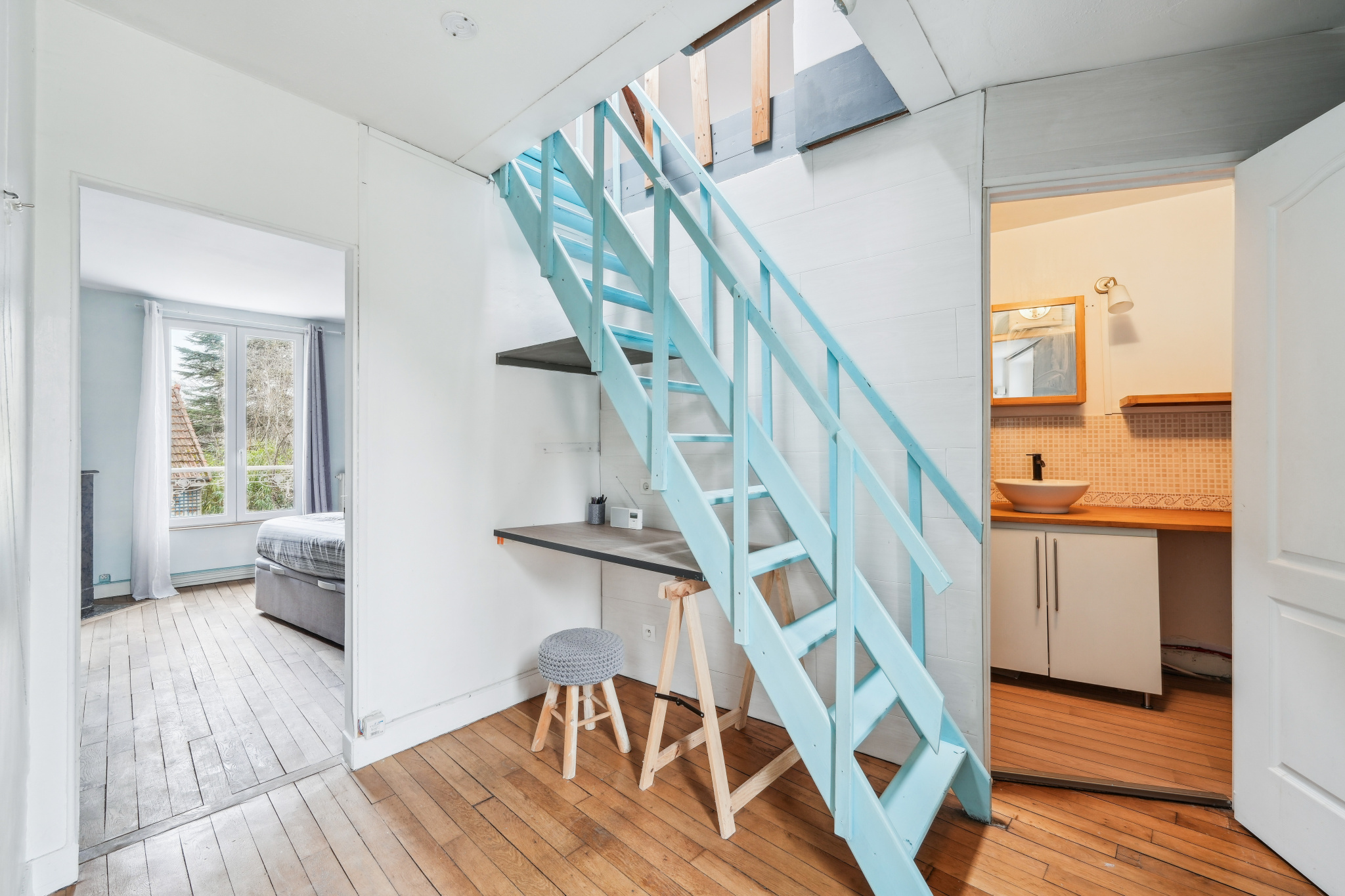 Au premier étage, un espace traversant avec placard de rangement, une salle d'eau, un espace bureau et une grande chambre avec son dressing.