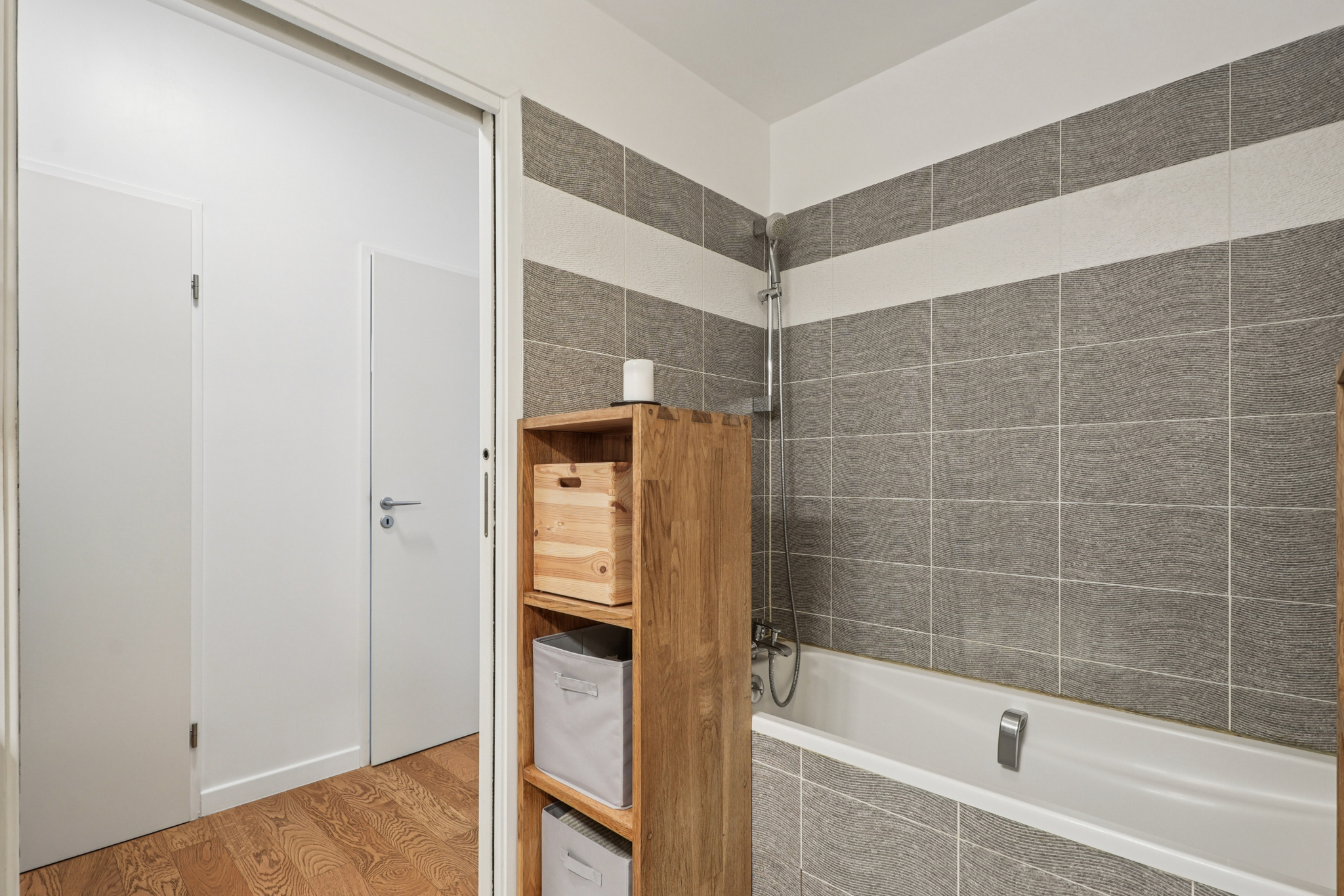 Dans le prolongement de l'entrée, vous découvrirez un WC indépendant avec un espace buanderie, une spacieuse salle de bain moderne (4.60m2) equipée d'une vasque et d'une baignoire, ainsi que deux belles chambres (14.60 m2 & 9m2) offrant un accès direct au jardin.