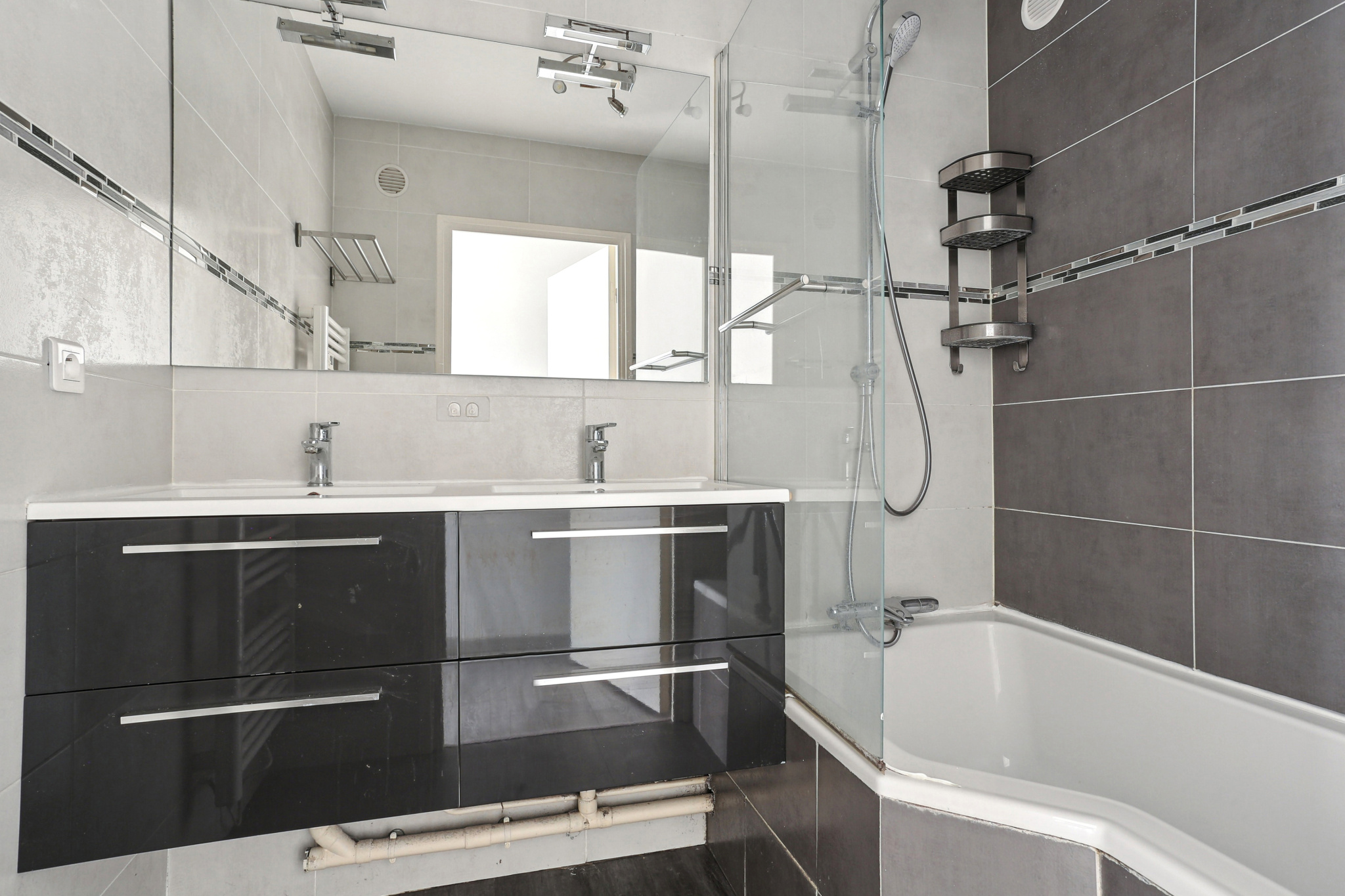 De l'autre côté, un dégagement distibuant, une salle d'eau moderne équipée d'une double vasque, d'une douche à l'italienne et de toilette. Il mène également à deux chambres, l'une avec balcon, l'autre dotée d'un grand dressing, toutes deux offrant de magnifiques vues dégagées sur la Vallée aux Loups.