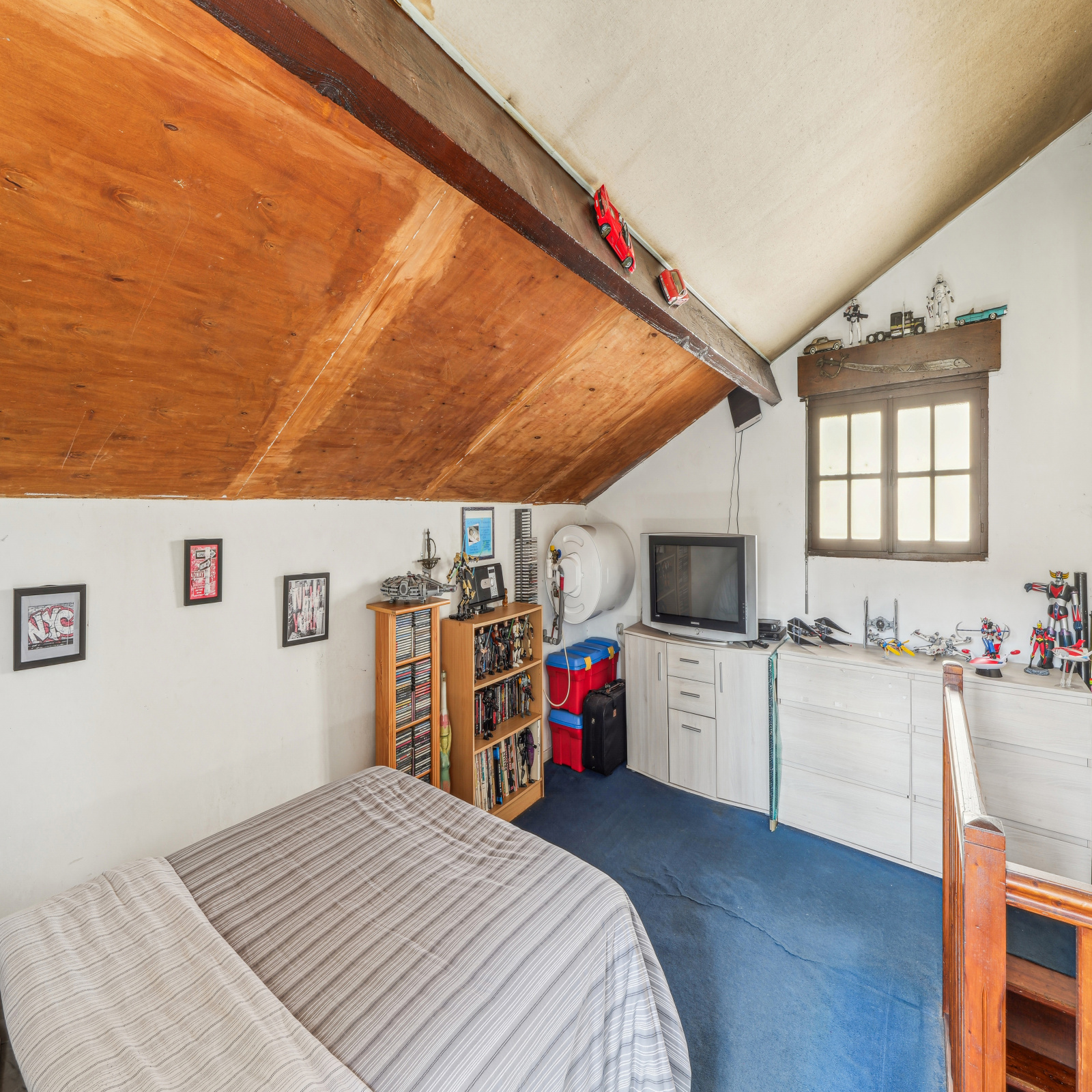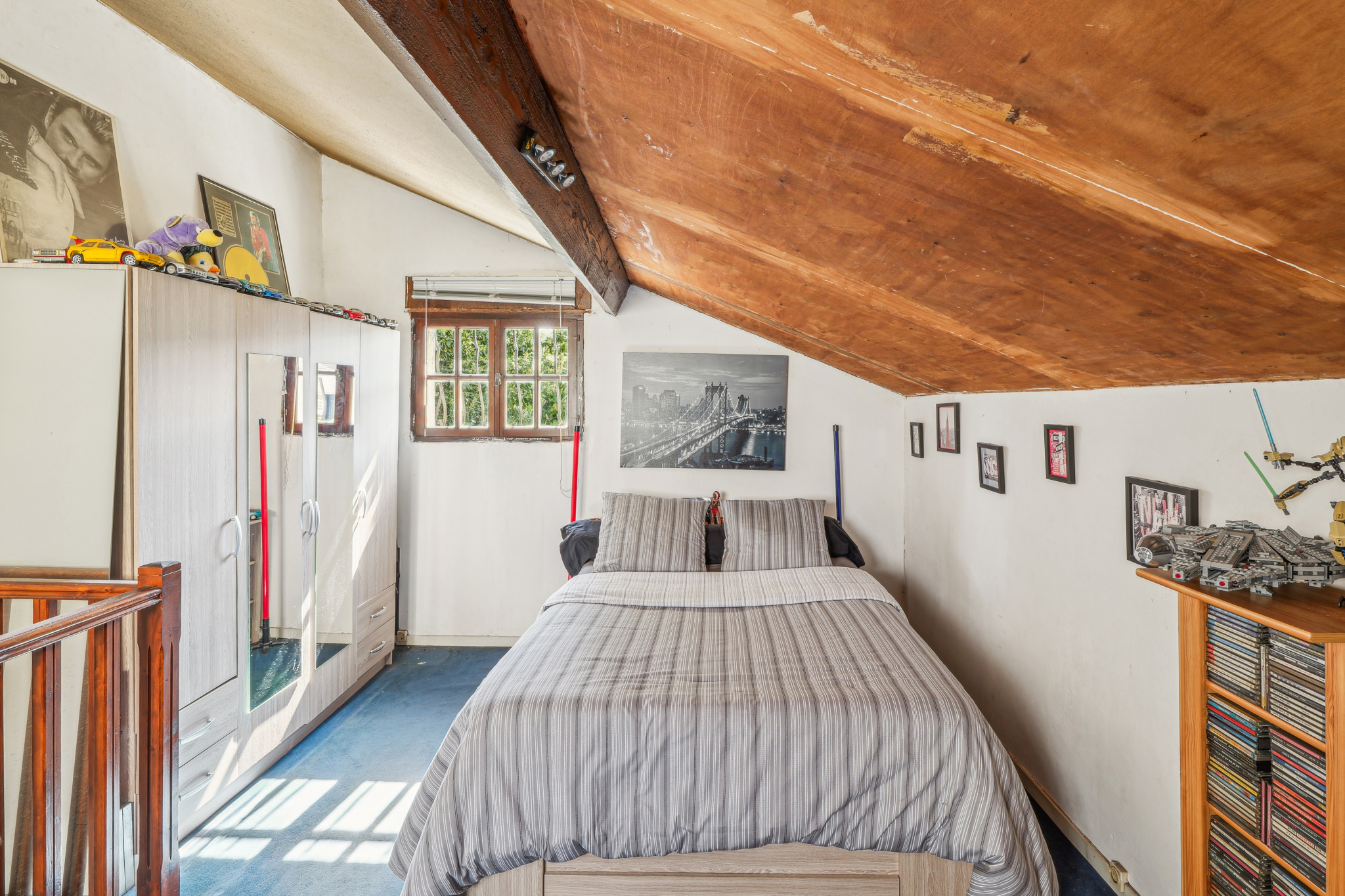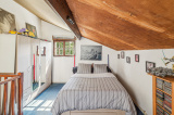 À l'étage : Vous trouverez une spacieuse chambre de (18m2 au sol) bénéficiant d'une belle hauteur sous plafond.