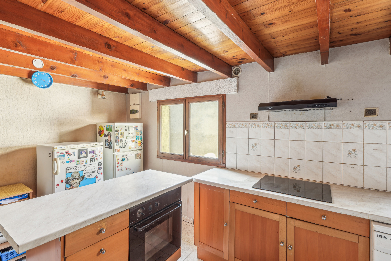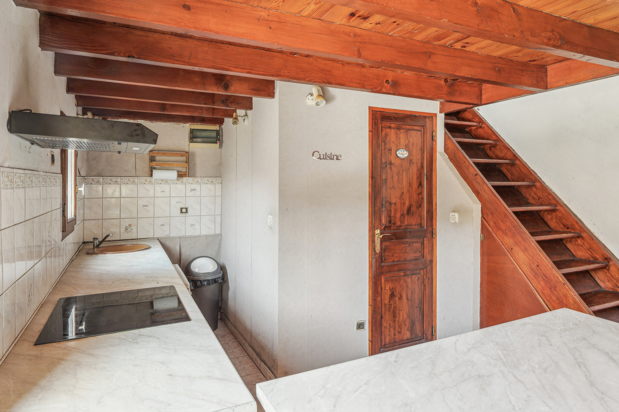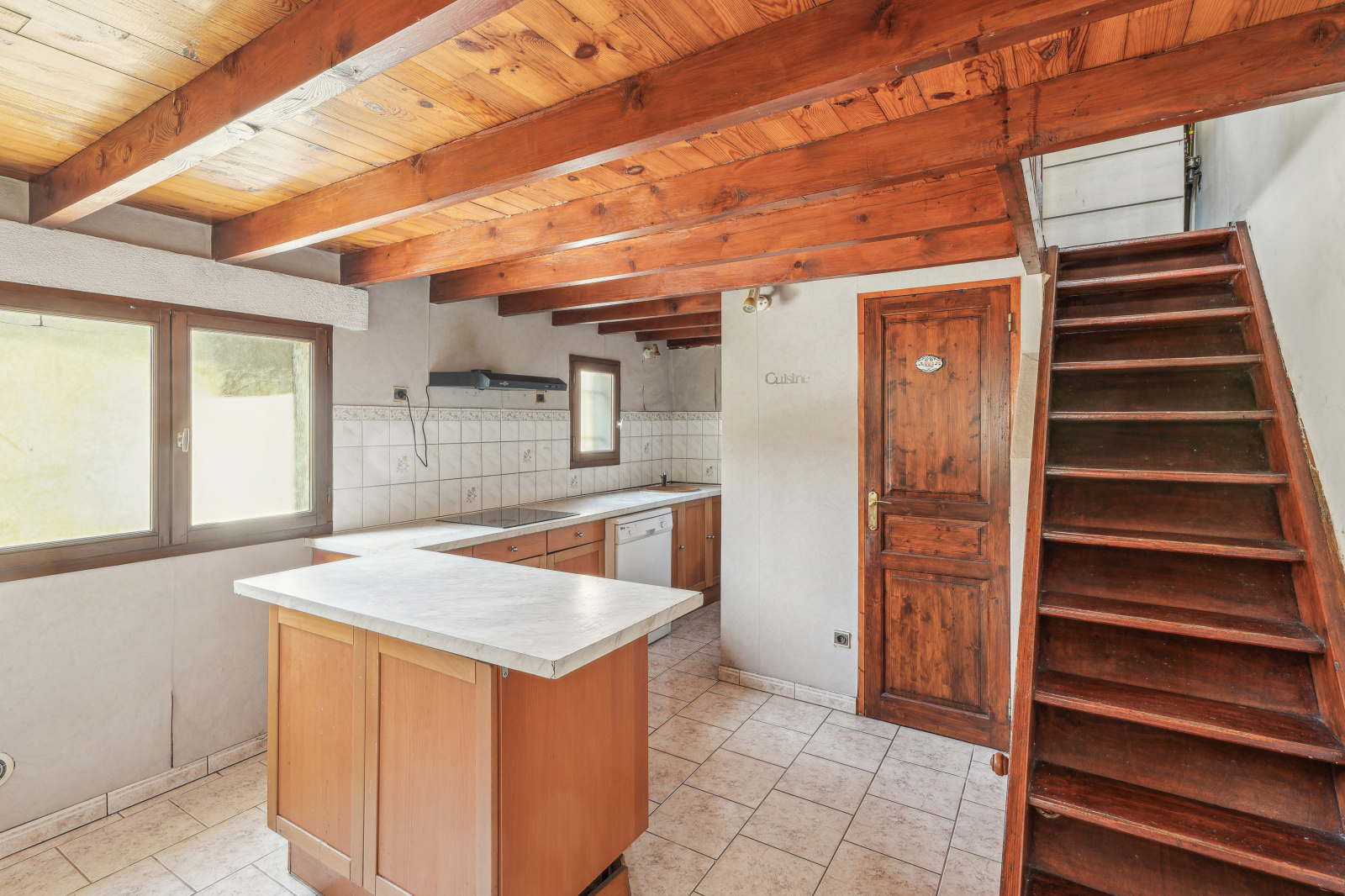 Au rez-de-chaussé : Vous trouverez un grand séjour avec hauteur sous plafond de 3 mètres ouvert sur un bel espace jardin / terrasse, prolongé d'une grande cuisine équipée avec four, plaques, hotte (neuve), frigo, meuble haut, meuble bas et plan de travail et d'une salle d'eau avec vasque, WC, et cabine de douche.