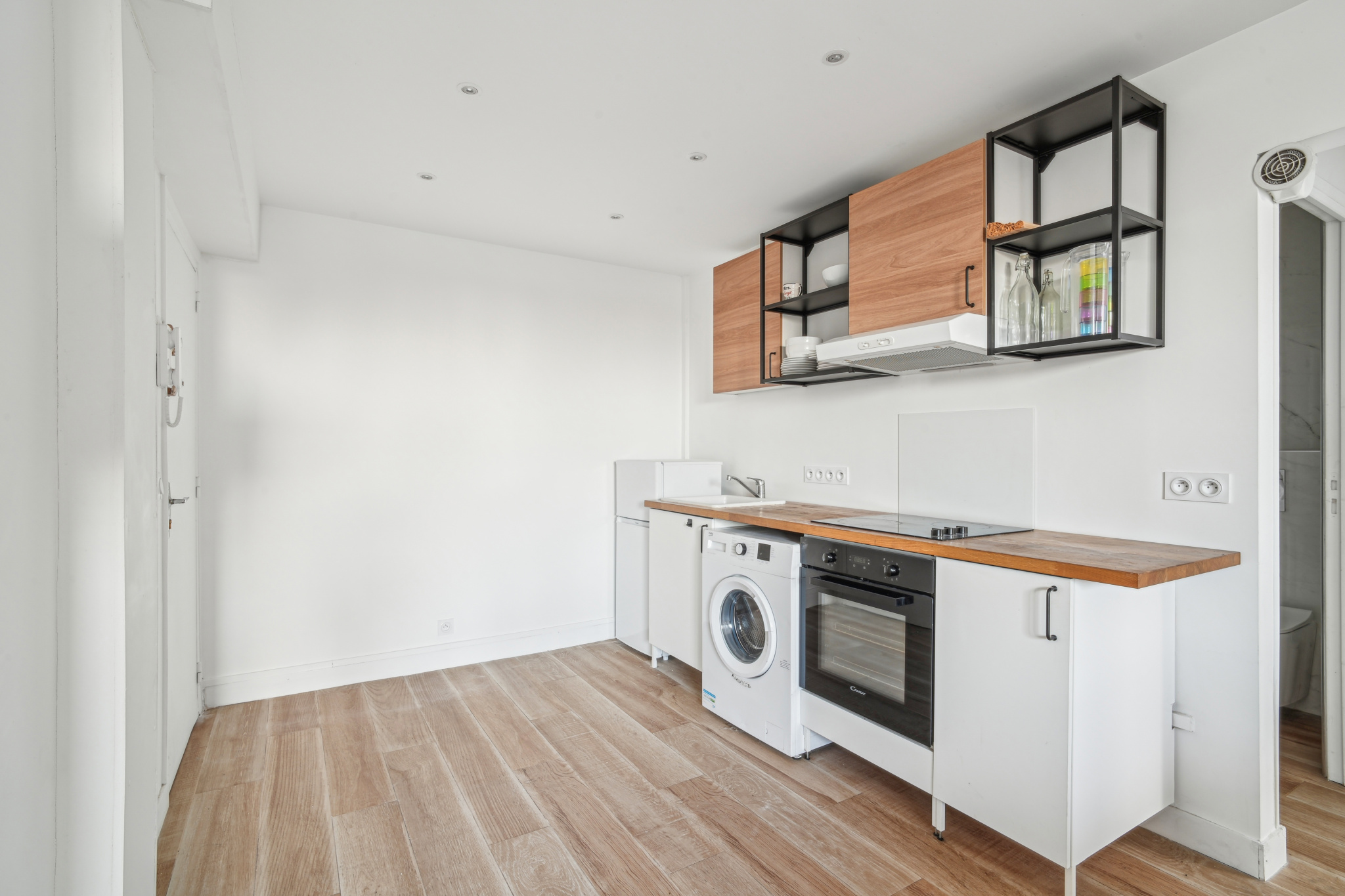 Il se compose d'un grand séjour/cuisine US entièrement équipée avec four, plaques, hotte, lave-linge, frigo, meuble haut, meuble bas et plan de travail exposé Sud Ouest avec belle vue dégagée sur les espaces verts de la résidence.