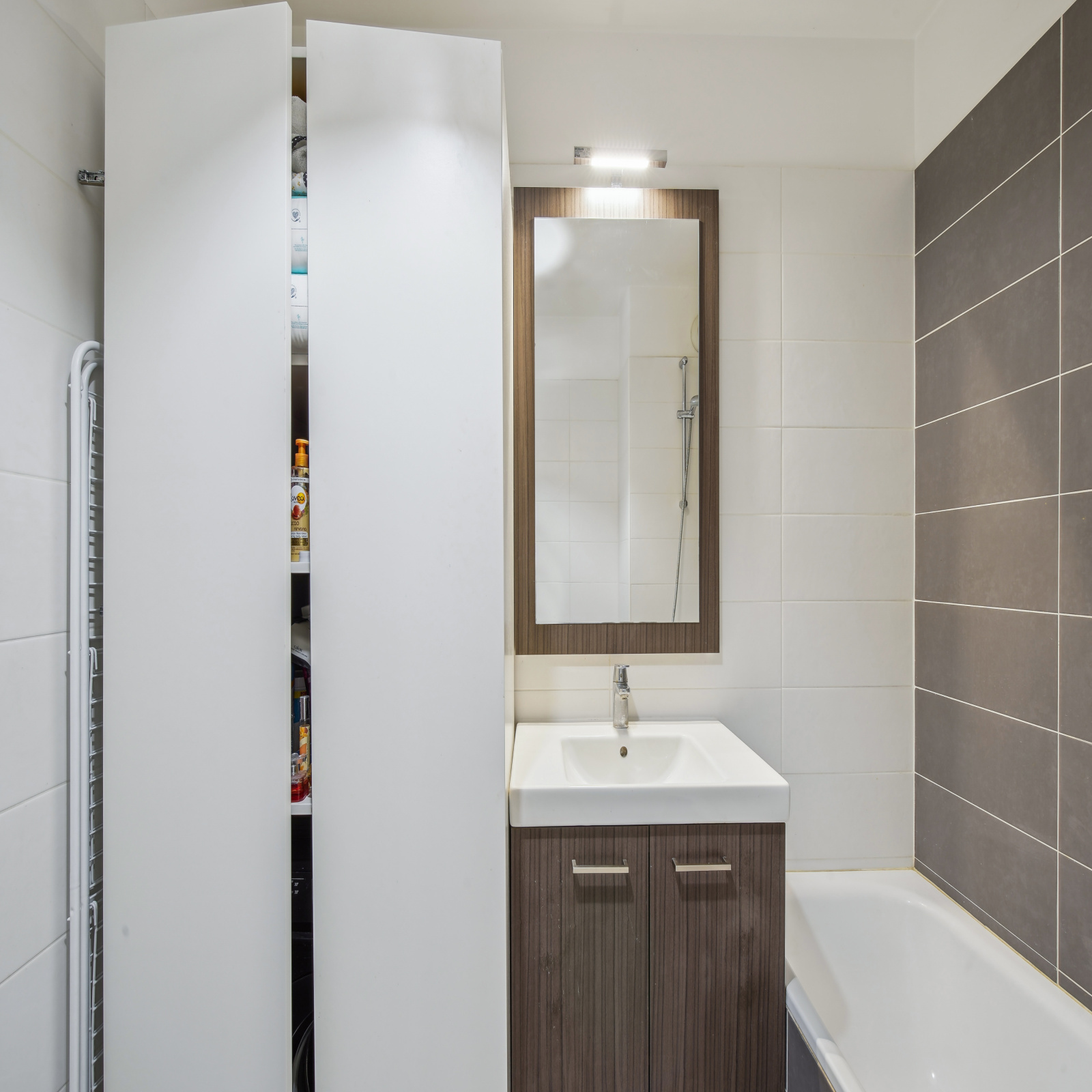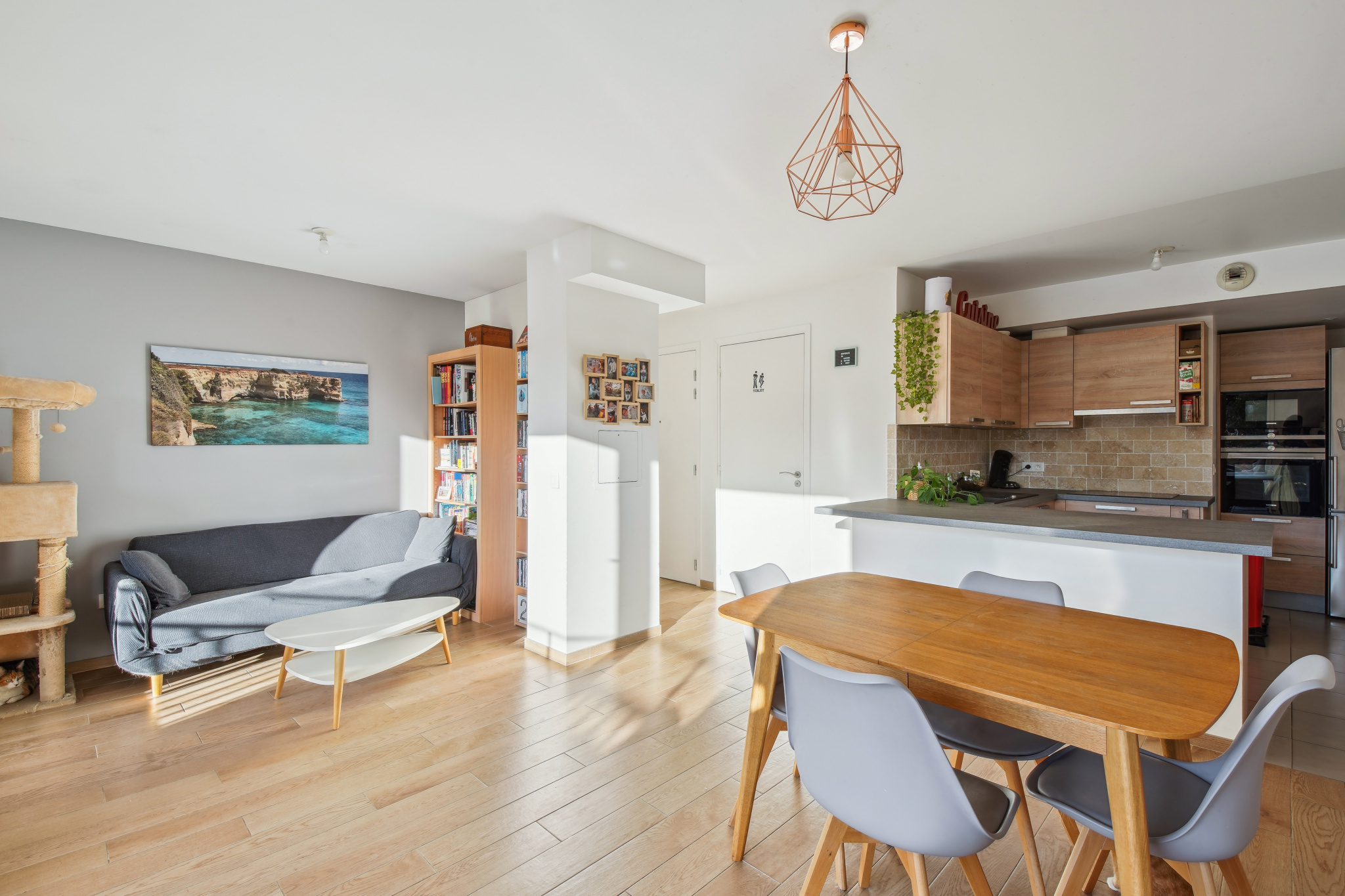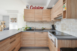 Il se compose d'une entrée avec deux placards de rangement sur mesure, distribuant d'un côté, un dégagement, deux grandes chambres, une salle de bain avec baignoire. De l'autre côté, un WC indépendant avec vasque et enfin une cuisine américaine toute équipée ouverte sur un grand séjour lumineux avec accès sur une belle et grande terrasse.