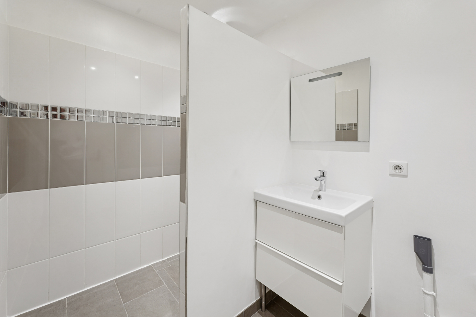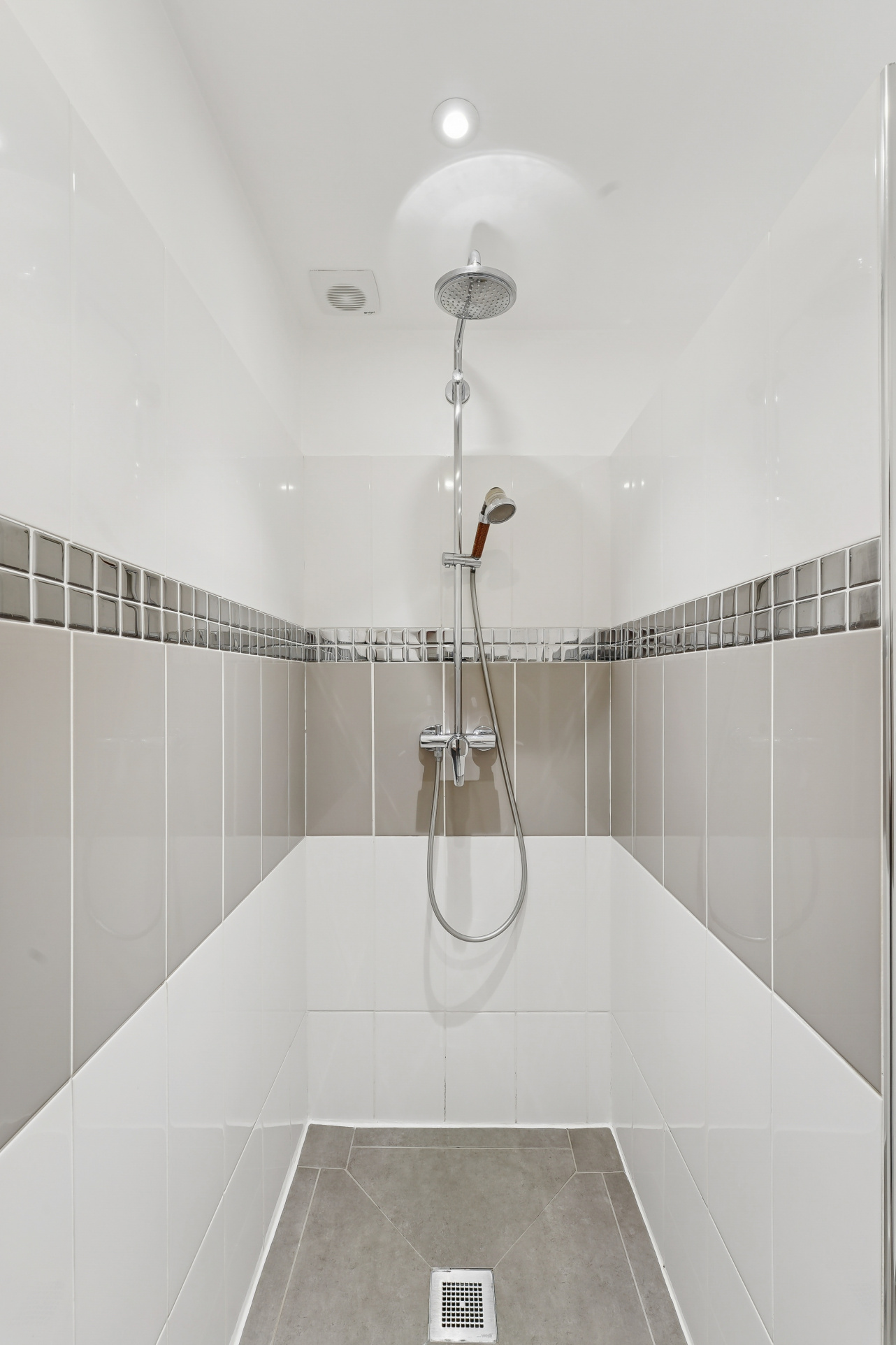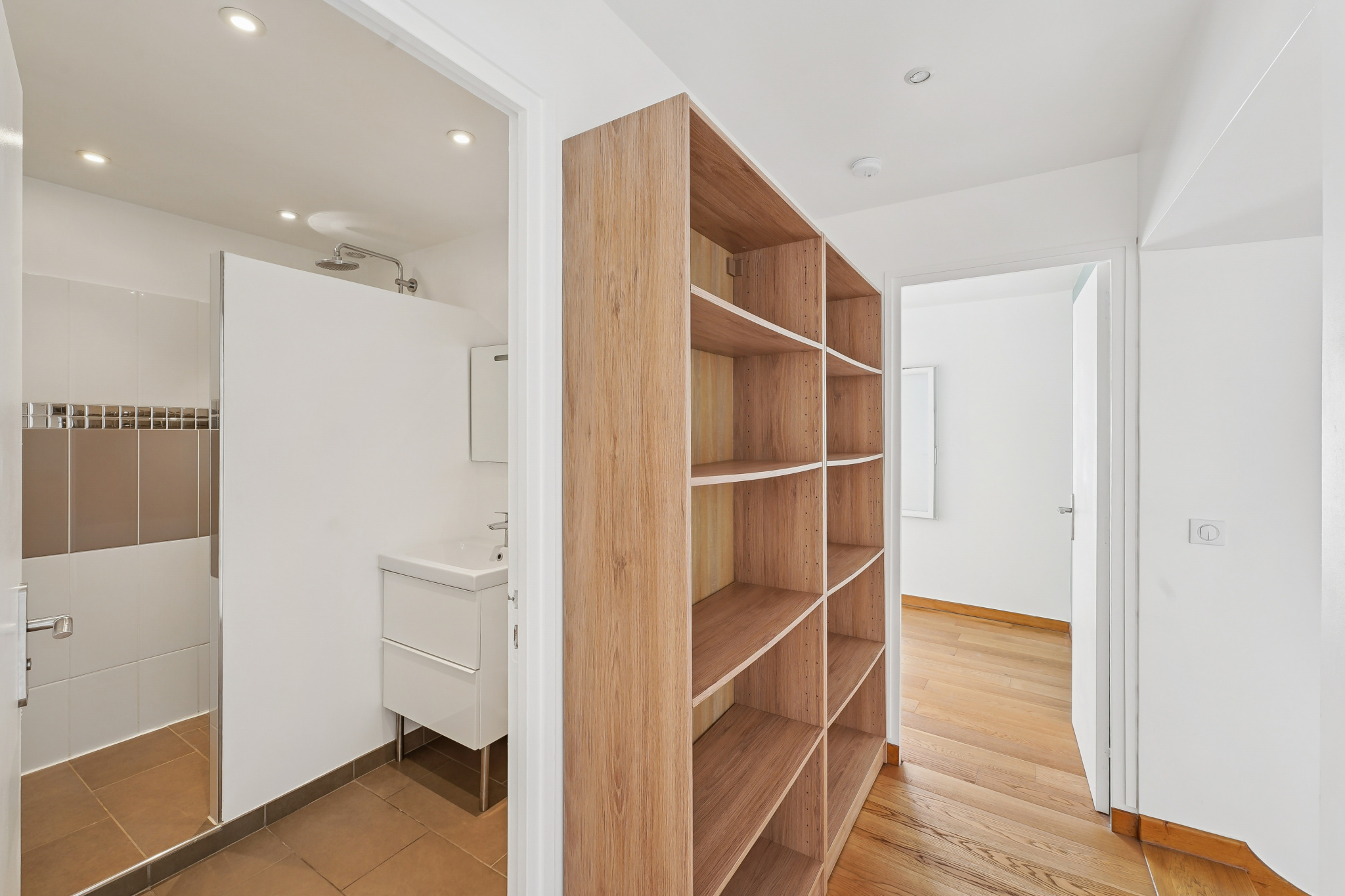 Dans le prolongement de cet espace, un pallier astucieusement aménagé avec de nombreux rangements mène à une première chambre chaleureuse, une salle d’eau moderne avec douche à l’italienne, vasque et arrivées d’eau pour une machine à laver, ainsi qu’à une seconde chambre lumineuse.